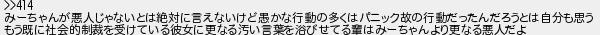 みーちゃんが悪人じゃないとは絶対に言えないけど愚かな行動の多くはパニック故の行動だったんだろうとは自分も思う もう既に社会的制裁を受けている彼女に更なる汚い言葉を浴びせてる輩はみーちゃんより更なる悪人だよ