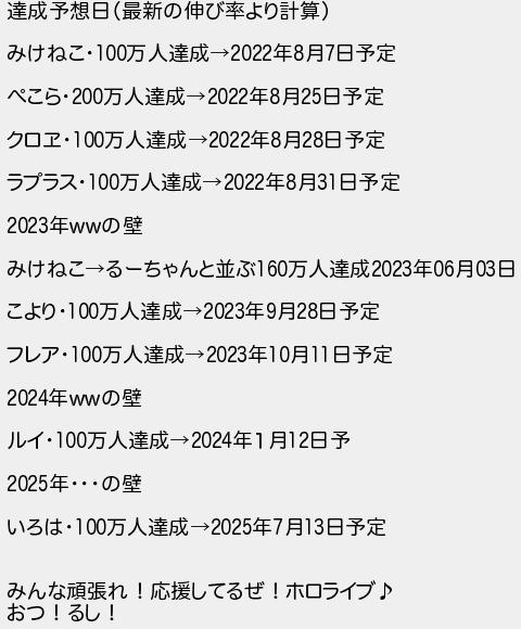 達成予想日最新の伸び率より計算 みけねこ万人達成年月日予定 ぺこら万人達成年月日予定 クロヱ万人達成年月日予定 ラプラス万人達成年月日予定 年の壁 みけねこるーちゃんと並ぶ万人達成年月日 こより万人達成年月日予定 フレア万人達成年月日予定 年の壁 ルイ万人達成年1月日予 年の壁 いろは万人達成年月日予定 みんな頑張れ!応援してるぜ!ホロライブ おつ!るし!