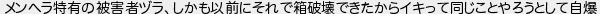 メンヘラ特有の被害者ヅラしかも以前にそれで箱破壊できたからイキって同じことやろうとして自爆