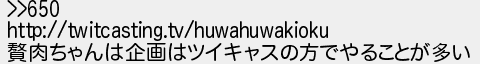653: [sage] 2022/04/18(月) 21:04:30 >>650 http://twitcasting.tv/huwahuwakioku 贅肉ちゃんは企画はツイキャスの方でやることが多い http://egg.5ch.net/test/read.cgi/streaming/1650124199/653