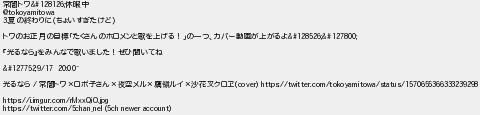 629: (スッップ Sdbf-Pkrc) [] 2022/09/17(土) 11:27:21.84 ID:xFSPKmIgd 常闇トワ👾休暇中 @tokoyamitowa 3.夏の終わりに(ちょいすぎたけど) トワのお正月の目標「たくさんのホロメンと歌を上げる!」の一つ、カバー動画が上がるよ😎🌸 『光るなら』をみんなで歌いました!ぜひ聞いてね 🌈9/17 20:00~ 光るなら / 常闇トワ×ロボ子さん×夜空メル×鷹嶺ルイ×沙花叉クロヱ(cover) https://twitter.com/tokoyamitowa/status/1570655366333239298 https://i.imgur.com/rMxxQiO.jpg https://twitter.com/5chan_nel (5ch newer account) http://egg.5ch.net/test/read.cgi/streaming/1660536607/629
