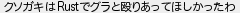 326: [] 2022/08/17(水) 21:42:23.38 クソガキはRustでグラと殴りあってほしかったわ http://egg.5ch.net/test/read.cgi/streaming/1660739607/326