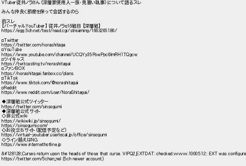 1: [sage] 2022/09/16(金) 03:41:08.23 VTuber従井ノラさん(深層家使用人一族・見習い執事)について語るスレ みんな仲良く節度を保って会話するのら 前スレ 【バーチャルYouTuber】 従井ノラ⚰16組目 【深層組】 https://egg.5ch.net/test/read.cgi/streaming/1663265186/ ⚰Twitter https://twitter.com/norashitaga ⚰YouTube https://www.youtube.com/channel/UCQYy35PowPpc6ImRH1TQgcw ⚰ツイキャス https://twitcasting.tv/norashitagai ⚰ファンBOX https://norashitagai.fanbox.cc/plans ⚰TikTok https://www.tiktok.com/@norashitagai ⚰Reddit https://www.reddit.com/user/NoraShitagai/ ◆深層組公式ツイッター https://twitter.com/sinsogumi ◆深層組公式サイト ◇非公式wiki https://wikiwiki.jp/sinsogumi/ https://sinsogumi.com/ ◇お役立ちサイト(配信予定など) https://virtual-youtuber.userlocal.jp/office/sinsogumi ◇ライン越えはNG https://www.internethotline.jp 💀Curses return upon the heads of those that curse. VIPQ2_EXTDAT: checked:vvvvvv:1000:512:: EXT was configured https://twitter.com/5chan_nel (5ch newer account) http://egg.5ch.net/test/read.cgi/streaming/1663267268/1