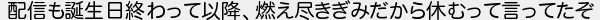 配信も誕生日終わって以降燃え尽きぎみだから休むって言ってたぞ