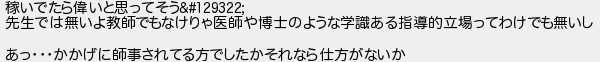 稼いでたら偉いと思ってそう 先生では無いよ教師でもなけりゃ医師や博士のような学識ある指導的立場ってわけでも無いし あっかかげに師事されてる方でしたかそれなら仕方がないか
