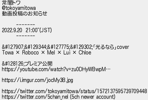 3: (スップ Sdbf-H5Op) [] 2022/09/21(水) 18:36:48.22 ID:14rl0jyGd 常闇トワ @tokoyamitowa 動画投稿のお知らせ ------- 2022.9.20 21:00~(JST) ------- 🎣🥀🌟🤖「光るなら」cover Towa × Roboco × Mel × Lui × Chloe 👾プレミア公開 https://youtube.com/watch?v=zu0DHyWBwpM… https://i.imgur.com/jocMy3B.jpg https://twitter.com/tokoyamitowa/status/1572137595739709448 https://twitter.com/5chan_nel (5ch newer account) http://egg.5ch.net/test/read.cgi/streaming/1663503146/3