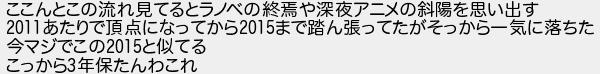 ここんとこの流れ見てるとラノベの終や深夜アニメの斜陽を思い出す あたりで頂点になってからまで踏ん張ってたがそっから一気に落ちた 今マジでこのと似てる こっから年保たんわこれ