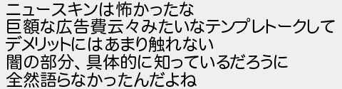 ニュースキンは怖かったな 巨額な広告費云みたいなテンプレトークして デメリットにはあまり触れない 闇の部分具体的に知っているだろうに 全然語らなかったんだよね