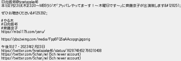 653: [sage] 2023/02/23(木) 22:34:00.09 日向坂46@hinatazaka46 本日2月23日(木)23:30~MBSラジオ「アッパレやってまーす!~木曜日です~」に齊藤京子が出演致します📻 ぜひお聴きください🥰 #やる木 #日向坂46 #齊藤京子 https://mbs1179.com/yaru/ https://pbs.twimg.com/media/Fpp6FQ5aAAcopgn.jpg:orig 午後10:27 ・ 2023年2月23日 https://twitter.com/hinatazaka46/status/1628748452766310408 https://twitter.com/5chan_nel (5ch newer account) https://twitter.com/5chan_nel (5ch newer account) http://egg.5ch.net/test/read.cgi/streaming/1676954641/653