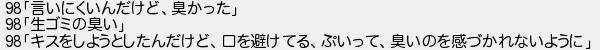 620: [sage] 2023/05/07(日) 02:05:59.65 98「言いにくいんだけど、臭かった」 98「生ゴミの臭い」 98「キスをしようとしたんだけど、口を避けてる、ぷいって、臭いのを感づかれないように」 http://egg.5ch.net/test/read.cgi/streaming/1683171747/620