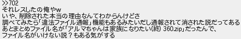 それレスしたの俺や いや削除された本当の理由なんてわからんけどさ 調べてみたら違法ファイル通報機能もあるみたいだし通報されて消された説だってある あとまとめファイル名がアルマちゃんは家族になりたい終 だったんで ファイル名がいけない説?もある気がする