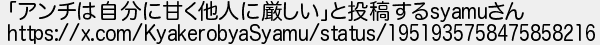 331: 3◆FWr5F.Z97A (ワッチョイ 5ba1-RCQa) [] 2025/08/04(月) 09:07:41.74 ID:N/tKL6+/0 「アンチは自分に甘く他人に厳しい」と投稿するsyamuさん https://x.com/KyakerobyaSyamu/status/1951935758475858216 http://egg.5ch.net/test/read.cgi/streaming/1752373032/331