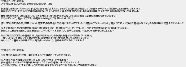 ゲスト 今月ちょっとブロマガの更新が間に合わないため 何回間に合わないんですか?何度同じ事を繰り返すんでしょうか?月額料金が発生している有料チャンネルだと言うことを理解してますか? 無料でアップロードすることで何の補填になってるんですか?全員が閲覧できる記事を全体公開してるだけで何の補填にもなってませんよ 貴女はただでさえ年にブロマガを月末ギリギリに更新するなと多くの会員から苦情を何度も受けています その対応として貴女はブロマガの更新方法を改めて説明しなおしました 月に回ある配信の内部屋でやった限定配信の直後にその時に着ているコスプレで撮影を行うといいました貴女がご自分で決めた更新方法ですその説明は当然覚えてますよね? 今月で言えば月日の限定配信後に服を着替えずに即撮影を行いアップロードしブロマガの更新を行うと説明しています 同時にミニ動画を撮影し限定動画としてアップロードするといい説明した当時一度テスト更新をしましたよね? そして新たなブロマガの更新方法が決まりましたがその提供条件が全く守られていません 一度テストをして満足してそれきりです何故月末ギリギリ更新に戻ってるのでしょうか? 今となっては更新すら出来てない月が多いですが当然返金対応するんですよね? ゲスト 来月分の有料ブロマガ一本をあげることで補填させていただきます 来月は来月の月額料金を支払ってる方へのアップロードですよね? 何が補填なんですか?月の料金を払ってる人への補填にはなりませんよね? 月分にアップロードする分は月の月額料金を支払ってる方への有料ブロマガ公開ですよね?