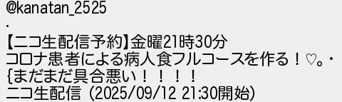 309: [sage] 2025/09/11(木) 15:22:04.00 ID:Hx47eYnE0 @kanatan_2525 · 【ニコ生配信予約】金曜21時30分 コロナ患者による病人食フルコースを作る!♡。・ {まだまだ具合悪い!!!! ニコ生配信 (2025/09/12 21:30開始) http://egg.5ch.net/test/read.cgi/streaming/1757071349/309