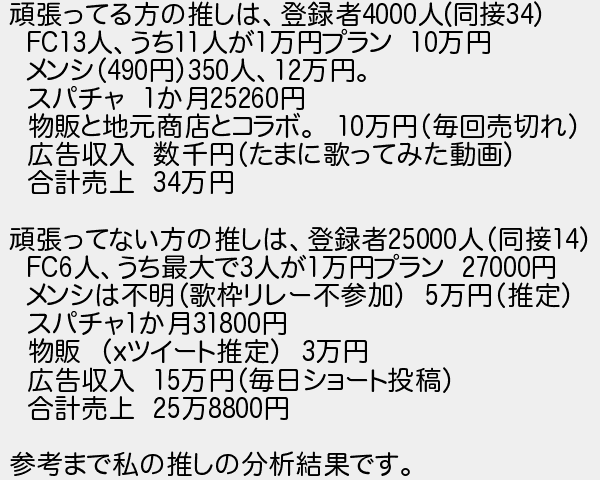 頑張ってる方の推しは登録者人同接 人うち人が万円プラン 万円 メンシ円人万円 スパチャ か月円 物販と地元商店とコラボ 万円毎回売切れ 広告収入 数千円たまに歌ってみた動画 合計売上 万円 頑張ってない方の推しは登録者人同接 人うち最大で人が万円プラン 円 メンシは不明歌枠リレー不参加 万円推定 スパチャか月円 物販 ツイート推定 万円 広告収入 万円毎日ショート投稿 合計売上 万円 参考まで私の推しの分析結果です