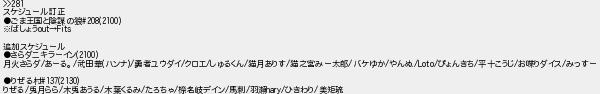 286: (ワッチョイW 2f2c-JL5w [240d:0:a405:e000:bcac:e75d:e4b9:e97e]) [sage] 2026/04/01(水) 22:03:45.78 ID:sZK8TKG60 >>281 スケジュール訂正 ●ごま王国と陰謀の狼#208(2100) ※ばしょうout→Fits 追加スケジュール ●さらダニキラーイン(2100) 月火さらダ/あーる。/武田華(ハンナ)/勇者ユウダイ/クロエ/しゅるくん/猫月ありす/猫之宮みー太郎/バケゆか/やんぬ/Loto/ぴょんきち/平十こうじ/お喋りダイス/みっすー ●りぜる村#137(2130) りぜる/兎月らら/木兎あうる/木葉くるみ/たろちゃ/㮈名岐デイン/馬刺/羽瀬hary/ひきわり/美矩琉 http://egg.5ch.io/test/read.cgi/streaming/1772368340/286