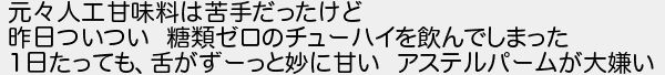 元人工甘味料は苦手だったけど 昨日ついつい 糖類ゼロのチューハイを飲んでしまった 1日たっても舌がずーっと妙に甘い アステルパームが大嫌い
