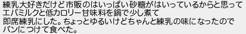 練乳大好きだけど市販のはいっぱい砂糖がはいっているからと思って エバミルクと低カロリー甘味料を鍋で少し煮て 即席練乳にしたちょっとゆるいけどちゃんと練乳の味になったので パンにつけて食べた