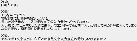957: 948 [sage] 2026/04/16(木) 12:12:15.01 ID:2FlBY5v4 >955 ド素人です。 >>954 そうなんですか? でも変数に初期値を設定しないと 書いた>948元のベースで複数文字の入力分岐もやっています。 入力後にメニュー戻りした次に未入力でエンターすると前回入力が残って同じ処理に入ってしまう なので変数に初期値を設定するようにしています。 >>956 それは単1文字以外に'CLR'とか複数文字入力混在の分岐もいけますか? http://mevius.5ch.io/test/read.cgi/tech/1663153441/957