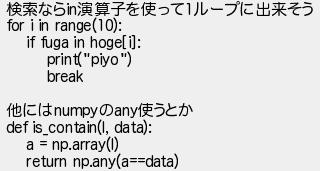 282: (ワントンキン MM3a-TLx9) [sage] 2022/10/13(木) 20:02:02.53 ID:PAZSTe6jM 検索ならin演算子を使って1ループに出来そう for i in range(10): if fuga in hoge[i]: print("piyo") break 他にはnumpyのany使うとか def is_contain(l, data): a = np.array(l) return np.any(a==data) http://mevius.5ch.net/test/read.cgi/tech/1663235546/282