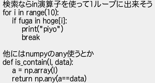 282: (ワントンキン MM3a-TLx9) [sage] 2022/10/13(木) 20:02:02.53 ID:PAZSTe6jM 検索ならin演算子を使って1ループに出来そう for i in range(10): if fuga in hoge[i]: print("piyo") break 他にはnumpyのany使うとか def is_contain(l, data): a = np.array(l) return np.any(a==data) http://mevius.5ch.net/test/read.cgi/tech/1663235546/282