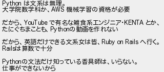 414: (ワッチョイ 2b4f-KWxC) [sage] 2022/10/21(金) 23:38:32.06 ID:X//QLN3D0 Python は文系は無理。 大学院数学科か、AWS 機械学習の資格が必要 だから、YouTube で有名な雑食系エンジニア・KENTA とか、 たにぐちまことも、Pythonの動画を作れない だから、英語だけできる文系女は皆、Ruby on Rails へ行く。 Railsは算数で十分 Pythonの文法だけ知っている香具師は、いらない。 仕事ができないから http://mevius.5ch.net/test/read.cgi/tech/1663235546/414