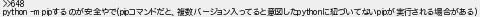 653: (ブーイモ MMdd-uk66) [] 2022/11/04(金) 19:16:21.95 ID:7+yqrzWjM >>648 python -m pipするのが安全やで(pipコマンドだと、複数バージョン入ってると意図したpythonに紐づいてないpipが実行される場合がある) http://mevius.5ch.net/test/read.cgi/tech/1663235546/653