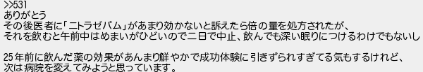 ありがとう その後医者にニトラゼパムがあまり効かないと訴えたら倍の量を処方されたが それを飲むと午前中はめまいがひどいので二日で中止飲んでも深い眠りにつけるわけでもないし 年前に飲んだ薬の効果があんまり鮮やかで成功体験に引きずられすぎてる気もするけれど 次は病院を変えてみようと思っています