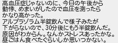 高血圧症じゃないのに今日の午後から 動めまいがしたので血圧を測ったら かなり高かった アルプラゾラム半錠飲んで様子みたが 下がらないので分後にもう半錠飲んだ 原因がわからんなんかストレスあったかな 昼ごはん食べたぐらいしか思いつかない