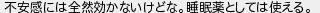 700: (ワッチョイ 9fc2-Dpix [2400:2200:735:8eb7:*]) [sage] 2024/03/08(金) 19:05:30.80 ID:oAkyGdZE0 不安感には全然効かないけどな。睡眠薬としては使える。 http://mevius.5ch.net/test/read.cgi/utu/1663213535/700