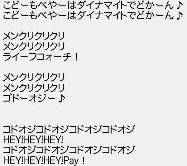 こどーもべやーはダイナマイトでどかーん こどーもべやーはダイナマイトでどかーん メンクリクリクリ メンクリクリクリ ライーフコォーチ! メンクリクリクリ メンクリクリクリ ゴドーオジー コドオジコドオジコドオジコドオジ コドオジコドオジコドオジコドオジ !