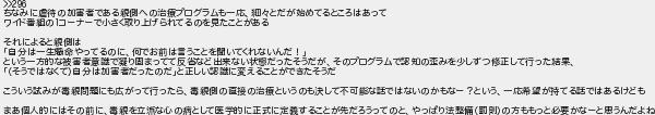 ちなみに虐待の加害者である親側への治療プログラムも一応細とだが始めてるところはあって ワイド番組のコーナーで小さく取り上げられてるのを見たことがある それによると親側は 自分は一生懸命やってるのに何でお前は言うことを聞いてくれないんだ! という一方的な被害者意識で凝り固まってて反省など出来ない状態だったそうだがそのプログラムで認知の歪みを少しずつ修正して行った結果 そうではなくて自分は加害者だったのだと正しい認識に変えることができたそうだ こういう試みが毒親問題にも広がって行ったら毒親側の直接の治療というのも決して不可能な話ではないのかもなー?という一応希望が持てる話ではあるけども まあ個人的にはその前に毒親を立派な心の病として医学的に正式に定義することが先だろうってのとやっぱり法整備罰則の方ももっと必要かなーと思うんだよね