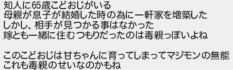 672: (オッペケ Sr11-duL+) [sage] 2022/10/24(月) 12:16:14.82 ID:iciL2pUQr 知人に65歳こどおじがいる 母親が息子が結婚した時の為に一軒家を増築した しかし、相手が見つかる事はなかった 嫁とも一緒に住むつもりだったのは毒親っぽいよね このこどおじは甘ちゃんに育ってしまってマジモンの無能 これも毒親のせいなのかもね http://mevius.5ch.net/test/read.cgi/utu/1663227257/672