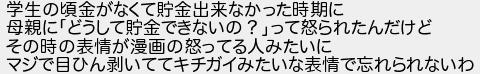 学生の頃金がなくて貯金出来なかった時期に 母親にどうして貯金できないの?って怒られたんだけど その時の表情が漫画の怒ってる人みたいに マジで目ひん剥いててキチガイみたいな表情で忘れられないわ