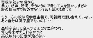 94: (ワッチョイ b710-Uef4) [sage] 2022/09/17(土) 02:23:06.51 ID:SEzi1fie0 毒親は幼少の頃から 暴力、怒声、恐喝、そういうので脅して人を動かしすぎた 終の棲家まで親の実家に住めと脅され続けた もう一方の親は高学歴主義で、両親間で話し合えていない あと自分は高学歴でないのに・・・ 高校卒業して浪人するまで常に追われ、 何も将来考えられなかった 高校以前の記憶が殆どない http://mevius.5ch.net/test/read.cgi/utu/1663227257/94