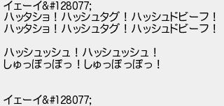 イェーイ ハッタショ!ハッシュタグ!ハッシュドビーフ! ハッタショ!ハッシュタグ!ハッシュドビーフ! ハッシュッシュ!ハッシュッシュ! しゅっぽっぽっ!しゅっぽっぽっ! イェーイ