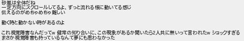 砂嵐は全体だね 一定方向にスクロールしてるよずっと流れる様に動いてる感じ 伝えるのがめちゃめちゃ難しい 動く時と動かない時があるのよ これ視覚障害なんだって 健常の知り合いにこの現象があるか聞いたら人共に無いって言われた ショックすぎる まさか視覚障害も持っているなんて夢にも思わなかった