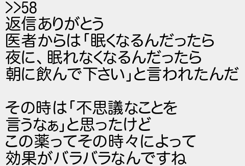 返信ありがとう 医者からは眠くなるんだったら 夜に眠れなくなるんだったら 朝に飲んで下さいと言われたんだ その時は不思議なことを 言うなぁと思ったけど この薬ってその時によって 効果がバラバラなんですね