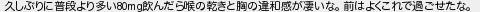 810: (オッペケ Sra3-Bu16) [sage] 2023/02/16(木) 11:21:11.83 ID:c1M+w1lJr 久しぶりに普段より多い80mg飲んだら喉の乾きと胸の違和感が凄いな。前はよくこれで過ごせたな。 http://mevius.5ch.net/test/read.cgi/utu/1666856428/810