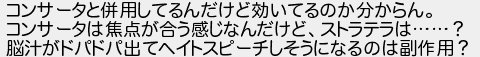 コンサータと併用してるんだけど効いてるのか分からん コンサータは焦点が合う感じなんだけどストラテラは? 脳汁がドパドパ出てヘイトスピーチしそうになるのは副作用?