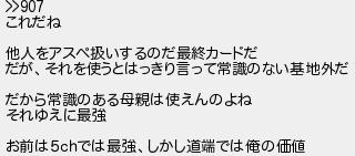 これだね 他人をアスペ扱いするのだ最終カードだ だがそれを使うとはっきり言って常識のない基地外だ だから常識のある母親は使えんのよね それゆえに最強 お前は5では最強しかし道端では俺の価値