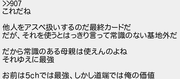 これだね 他人をアスペ扱いするのだ最終カードだ だがそれを使うとはっきり言って常識のない基地外だ だから常識のある母親は使えんのよね それゆえに最強 お前は5では最強しかし道端では俺の価値
