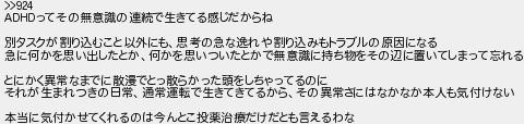 925: (テテンテンテン MMcb-d0qa) [sage] 2023/02/21(火) 15:11:32.01 ID:dicpyjXkM >>924 ADHDってその無意識の連続で生きてる感じだからね 別タスクが割り込むこと以外にも、思考の急な逸れや割り込みもトラブルの原因になる 急に何かを思い出したとか、何かを思いついたとかで無意識に持ち物をその辺に置いてしまって忘れる とにかく異常なまでに散漫でとっ散らかった頭をしちゃってるのに それが生まれつきの日常、通常運転で生きてきてるから、その異常さにはなかなか本人も気付けない 本当に気付かせてくれるのは今んとこ投薬治療だけだとも言えるわな http://mevius.5ch.net/test/read.cgi/utu/1666856428/925