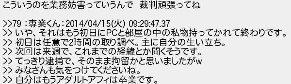 653: [age] 2016/05/02(月) 23:15:19.47 こういうのを業務妨害っていうんで 裁判頑張ってね >>79 :専業くん:2014/04/15(火) 09:29:47.37 >> いや、それはもう初日にPCと部屋の中の私物持ってかれて終わりです。 >> 初日は任意で2時間の取り調べ。主に自分の生い立ち。 >> 次回は来週で、これまでの経緯とか聞くそうです。 >> てっきり逮捕で、そのまま拘留かと思いましたがw >> みなさんも気をつけてくださいね。 >> 自分はもうアダルトアフィは卒業です。 http://mercury.bbspink.com/test/read.cgi/webmaster/1461249076/653