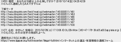 653: [] 2016/12/11(日) 21:35:56.79 >>650 :確認 : あなたは18歳以上の名無しですか?2016/10/14(金) 04:29:42.09 >>どんどん通報したらええですやんw 了解でーす http://nasu.bbspink.com/test/read.cgi/webmaster/1450000511/481 http://nasu.bbspink.com/test/read.cgi/webmaster/1450000511/483 http://nasu.bbspink.com/test/read.cgi/webmaster/1450000511/485 http://nasu.bbspink.com/test/read.cgi/webmaster/1450000511/493 http://nasu.bbspink.com/test/read.cgi/webmaster/1450000511/497 http://nasu.bbspink.com/test/read.cgi/webmaster/1450000511/500 >>271 名前: ゆきんこ 投稿日: 2015/02/28(土) 17:13:08 ID:OLCBvWcw [ i60-47-176-39.s05.a003.ap.plala.or.jp ] >>ふむふむ、おれは岩手の南部だよ〜ん 通報先はこちらにお願いします。 https://www.iajapan.org/hotlinecenter/illegal-full.html インターネット上の違法・有害情報の通報フォーム http://mercury.bbspink.com/test/read.cgi/webmaster/1480935810/653