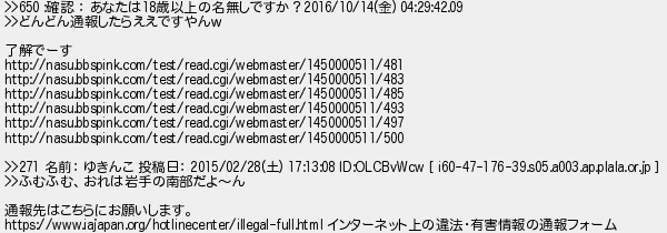確認 あなたは歳以上の名無しですか?金 どんどん通報したらええですやん 了解でーす 名前 ゆきんこ 投稿日 土 ふむふむおれは岩手の南部だよん 通報先はこちらにお願いします インターネット上の違法有害情報の通報フォーム