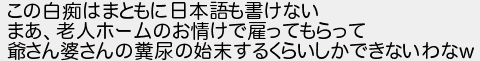 この白痴はまともに日本語も書けない まあ老人ホームのお情けで雇ってもらって 爺さん婆さんの糞尿の始末するくらいしかできないわな