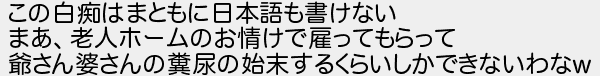 この白痴はまともに日本語も書けない まあ老人ホームのお情けで雇ってもらって 爺さん婆さんの糞尿の始末するくらいしかできないわな