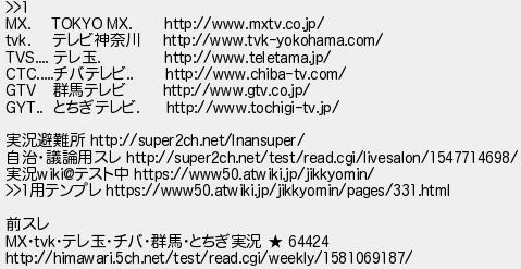 13: [sage] 2020/02/07(金) 22:22:52 ID:fXuP9LFz >>1 MX. TOKYO MX. http://www.mxtv.co.jp/ tvk. テレビ神奈川 http://www.tvk-yokohama.com/ TVS.... テレ玉. http://www.teletama.jp/ CTC.....チバテレビ.. http://www.chiba-tv.com/ GTV 群馬テレビ http://www.gtv.co.jp/ GYT.. とちぎテレビ. http://www.tochigi-tv.jp/ 実況避難所 http://super2ch.net/lnansuper/ 自治・議論用スレ http://super2ch.net/test/read.cgi/livesalon/1547714698/ 実況wiki@テスト中 https://www50.atwiki.jp/jikkyomin/ >>1用テンプレ https://www50.atwiki.jp/jikkyomin/pages/331.html 前スレ MX・tvk・テレ玉・チバ・群馬・とちぎ実況 ★ 64424 http://himawari.5ch.net/test/read.cgi/weekly/1581069187/ http://himawari.5ch.net/test/read.cgi/weekly/1581069708/13