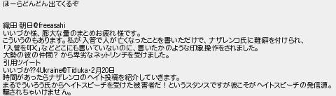 56: [] 2023/02/21(火) 23:37:09.16 ほーらどんどん出てくるぞ 織田 朝日@freeasahi いいづか様、膨大な量のまとめお疲れ様です。 こういうのもあります。私が入管で人が亡くなったことを書いただけで、ナザレンコ氏に難癖を付けられ、 「入管を叩く」などどこにも書いていないのに、書いたかのような印象操作をされました。 大勢の彼の仲間?から卑劣なネットリンチを受けました。 引用ツイート いいづか??4Ukraine@Tiiduka・2月20日 時間があったらナザレンコのヘイト投稿を紹介していきます。 まるでういろう氏からヘイトスピーチを受けた被害者だ!というスタンスですが彼こそがヘイトスピーチの発信源。 騙されちゃいけません。 http://mevius.5ch.net/test/read.cgi/zassi/1452840887/56